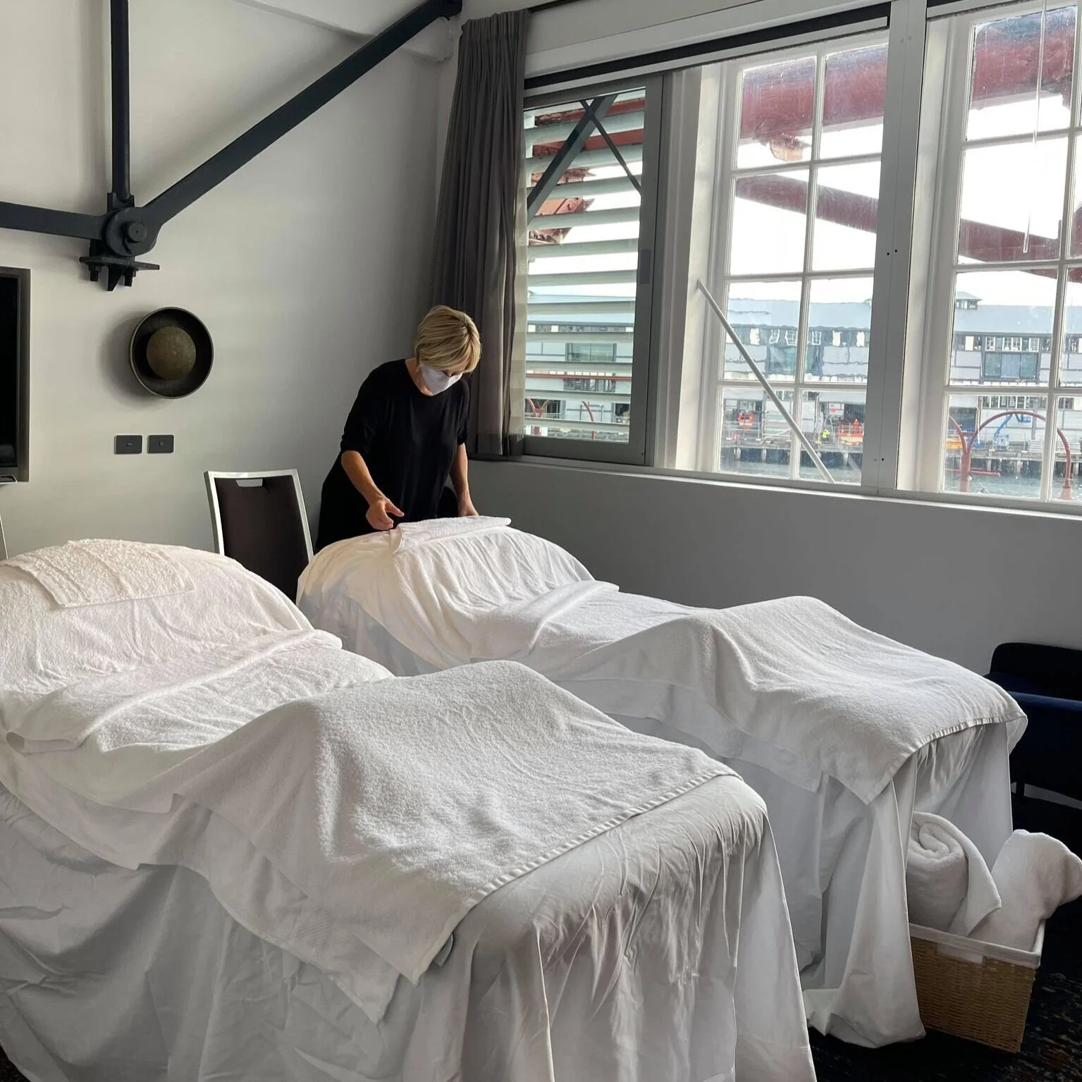 We come armed with everything, including blankets, towels, and massage products. All we need is a clean space to set up the equipment.